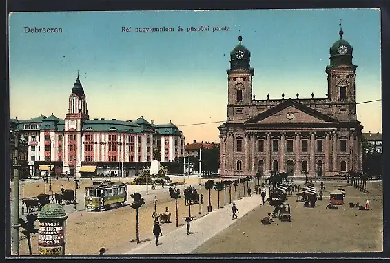 AK Debreczen, Ref. uagytemplom es püspöki palota, Strassenbahn