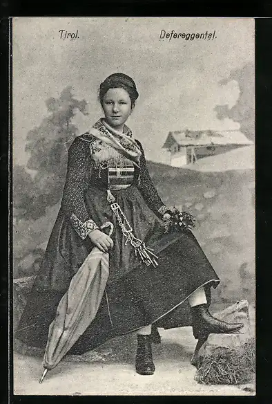 AK Defereggental /Tirol, Junge Frau mit Regenschirm in lokaler Tracht