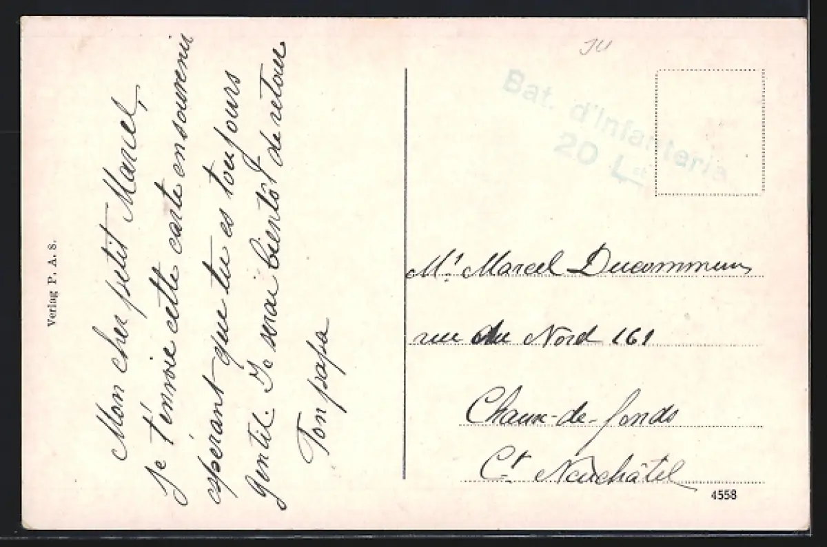 Personenbezogene Daten auf der Rückseite der Karte wurden durch blauen Textmarker unkenntlich gemacht. Die blauen Stellen sind auf die Vorderseite durchgeweicht und wirken sich negativ auf das Postkartenfoto aus