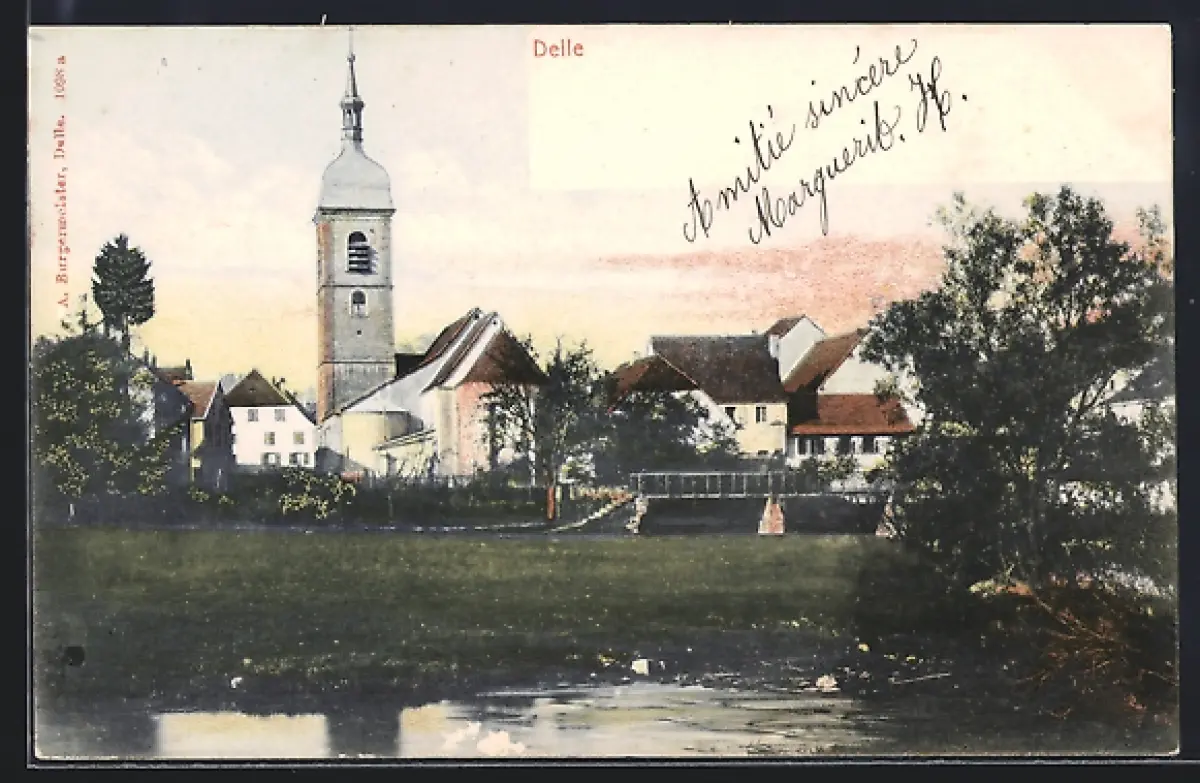 AK Delle, Vue sur l`église et les maisons au bord de l`eau