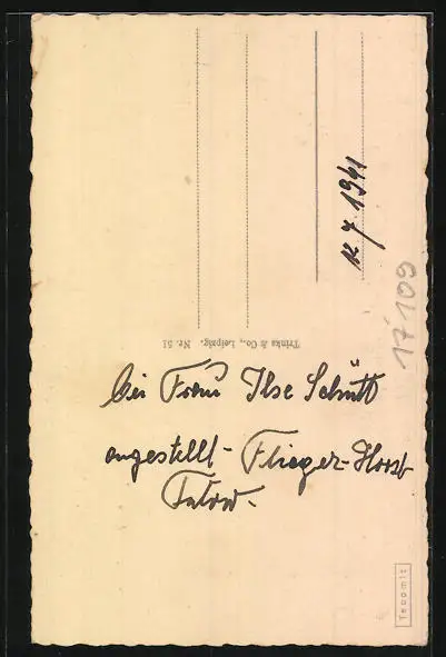 Personenbezogene Daten auf der Rückseite der Karte wurden durch blauen Textmarker unkenntlich gemacht. Die blauen Stellen sind auf die Vorderseite durchgeweicht und wirken sich negativ auf das Postkartenfoto aus