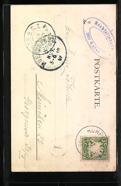 Personenbezogene Daten auf der Rückseite der Karte wurden durch blauen Textmarker unkenntlich gemacht. Die blauen Stellen sind auf die Vorderseite durchgeweicht und wirken sich negativ auf das Postkartenfoto aus