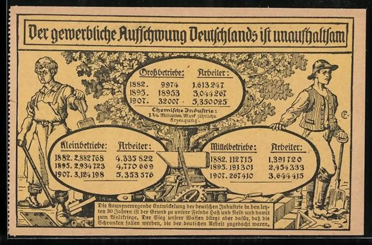 AK Der gewerbliche Aufschwung Deutschlands ist unaufhaltsam, Statistische Daten, Schmied und Bauarbeiter, Propaganda 1