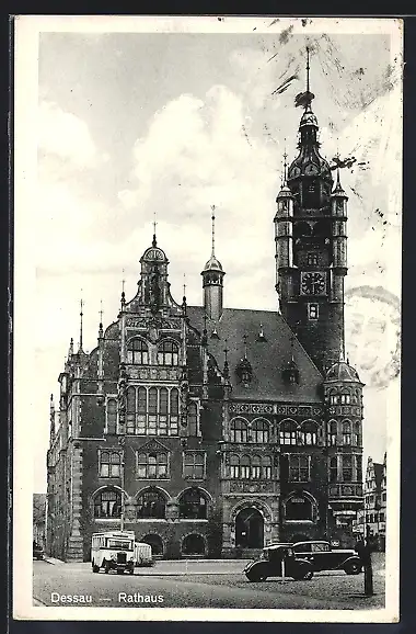 AK Dessau, Rathaus mit Bus und Autos