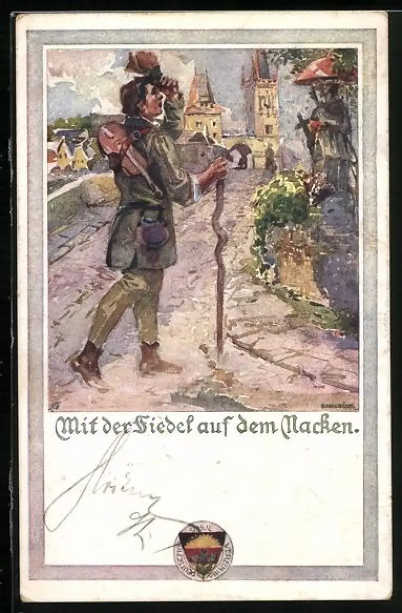 AK Deutscher Schulverein NR 444: Mit der Fiedel auf dem Nacken, Wandermusiker zieht in eine Stadt ein