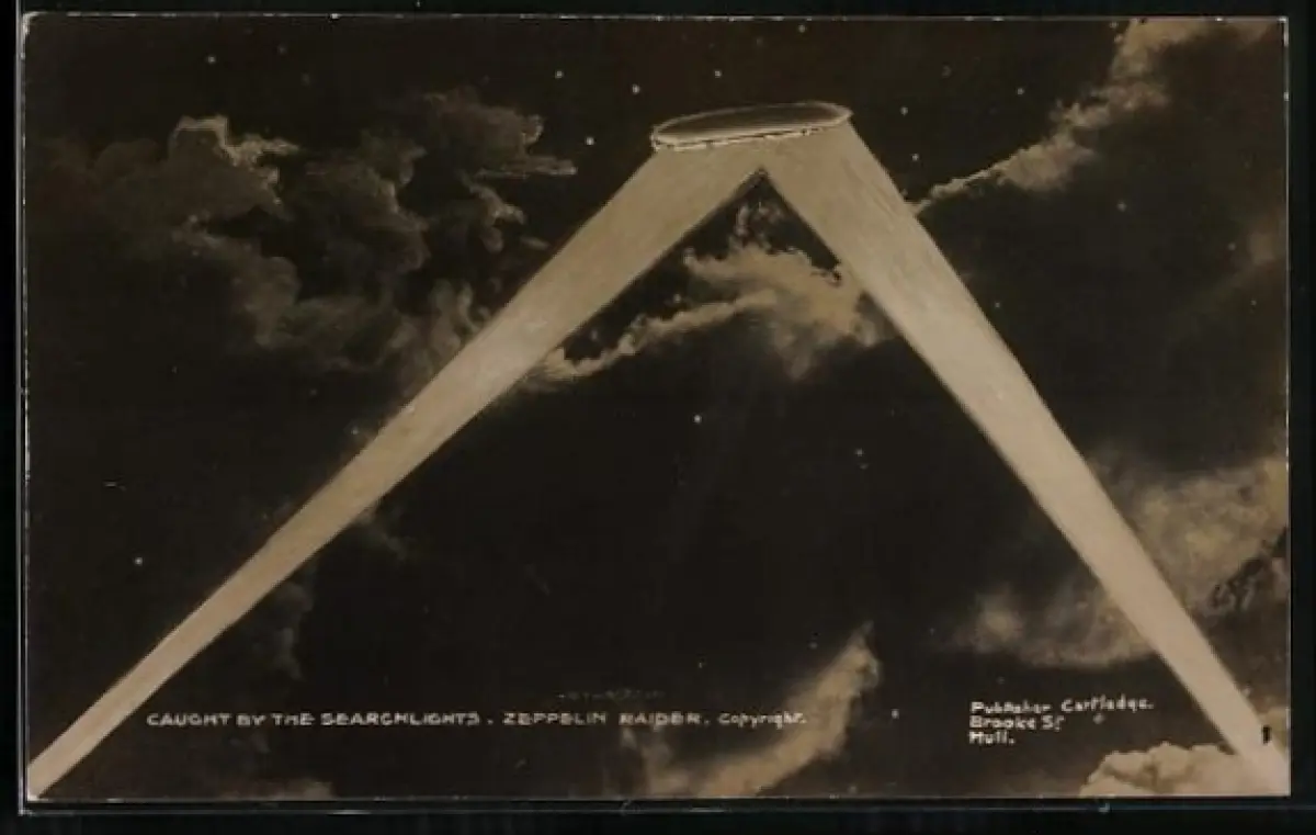 AK Deutscher Zeppelin wird von Suchscheinwerfern erfasst