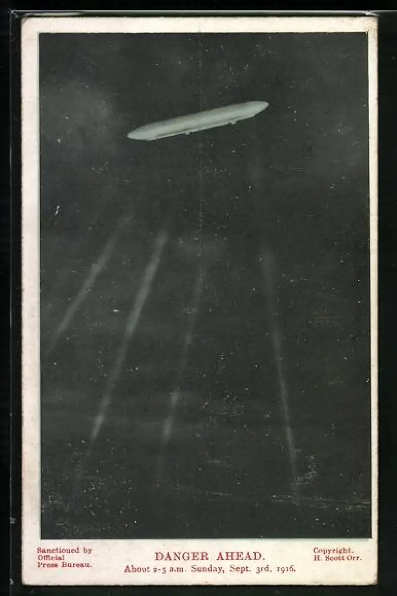 AK Deutscher Zeppelin wird von englischen Suchscheinwerfern angestrahlt, 1916