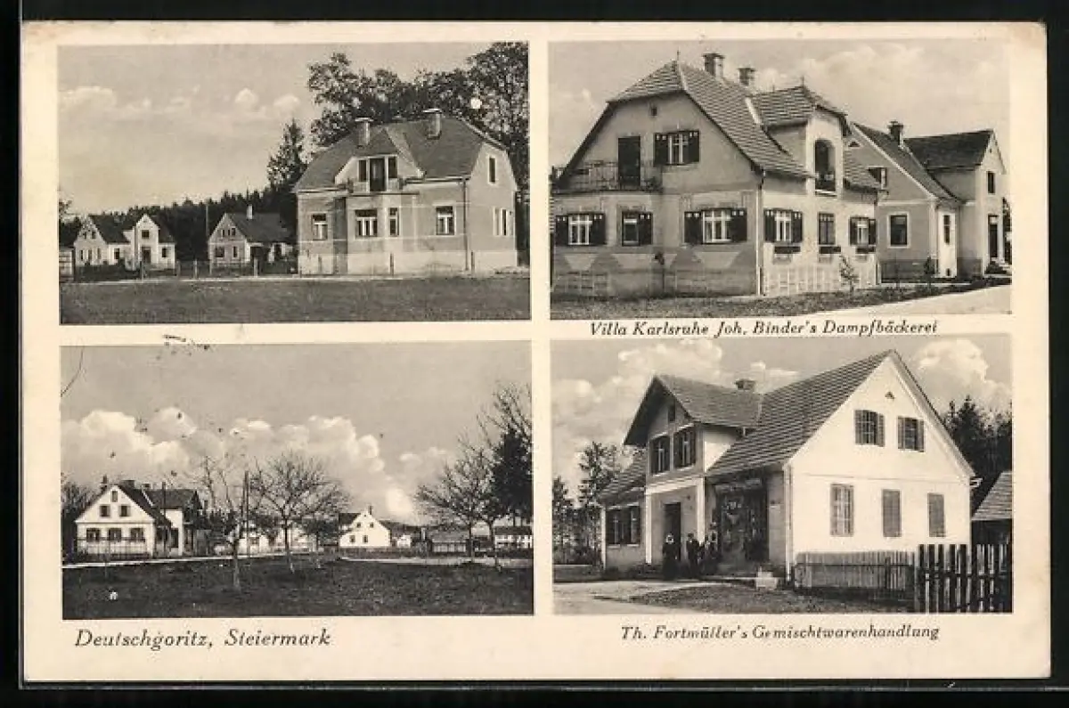 AK Deutschgoritz /Steiermark, Th. Fortmüllers Gemischtwarenhandlung, Villa Karlsruhe Joh. Binders Dampfbäckerei