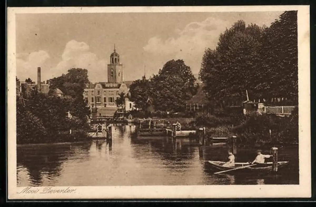 AK Deventer, Flusspartie mit Turmgebäude und Ruderboot