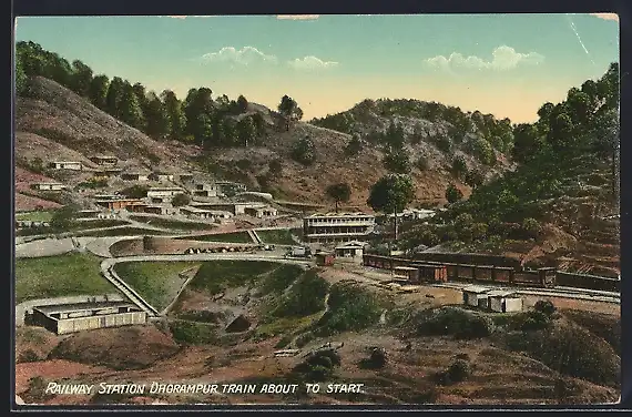 AK Dhorampur, Railway Station, Train about to Start, Eisenbahn mit Waggons und bergiger Landschaft