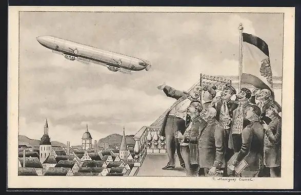 AK Die erste Luft-Personenpost, Soldaten beobachten Zeppelin in der Luft