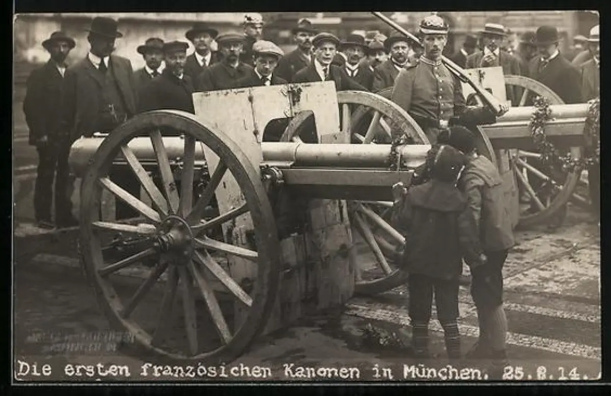 AK Die ersten französischen Kanonen in München, mit Publikum u. Kindern