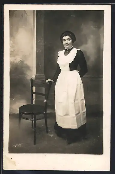 AK Dienstmädchen in Arbeitskleidung neben einem Stuhl