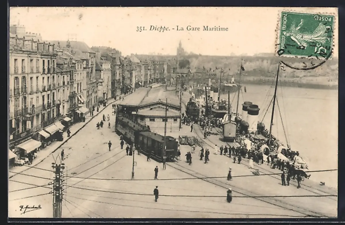 AK Dieppe, La Gare Maritime avec tram et quai animé