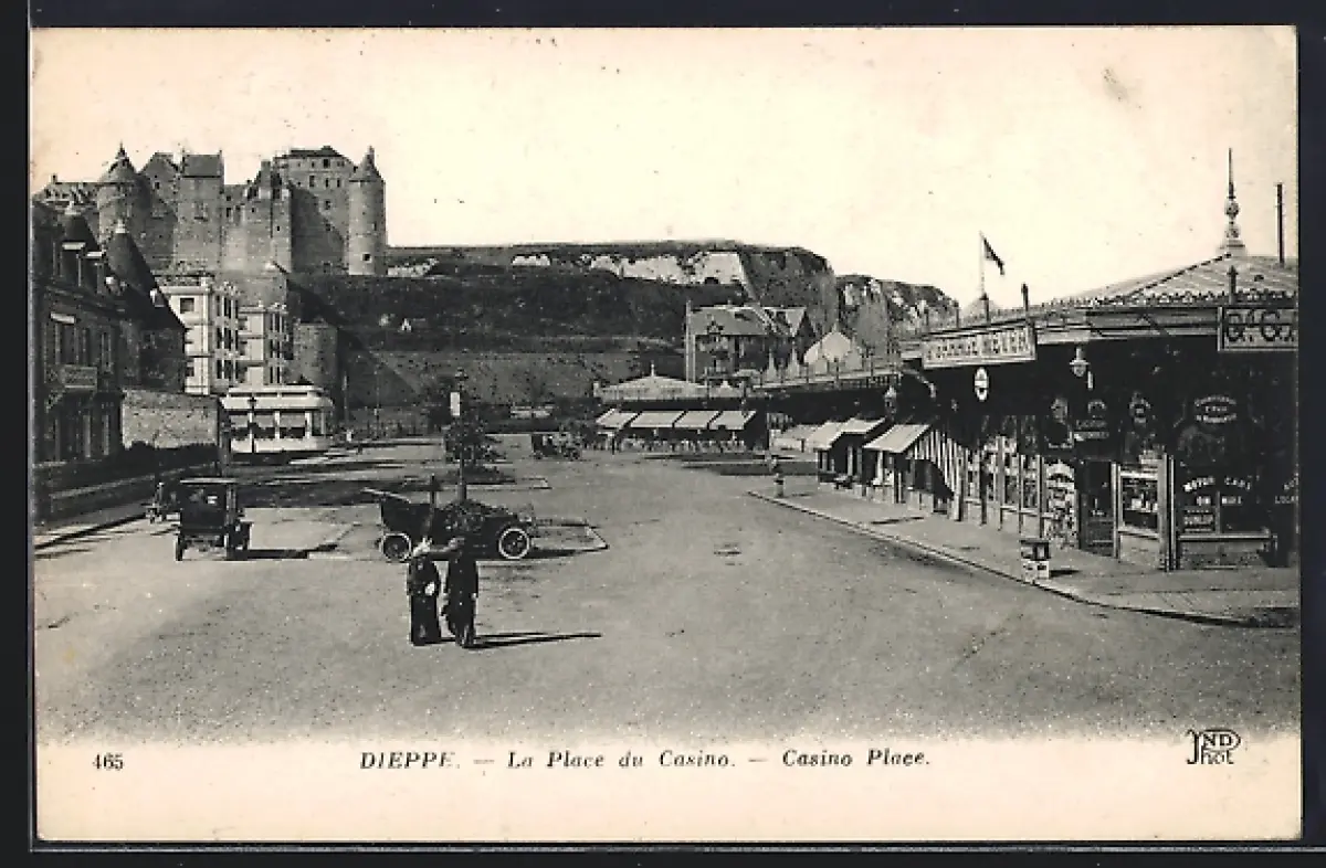 AK Dieppe, La Place du Casino avec vue sur le château et les commerces adjacents