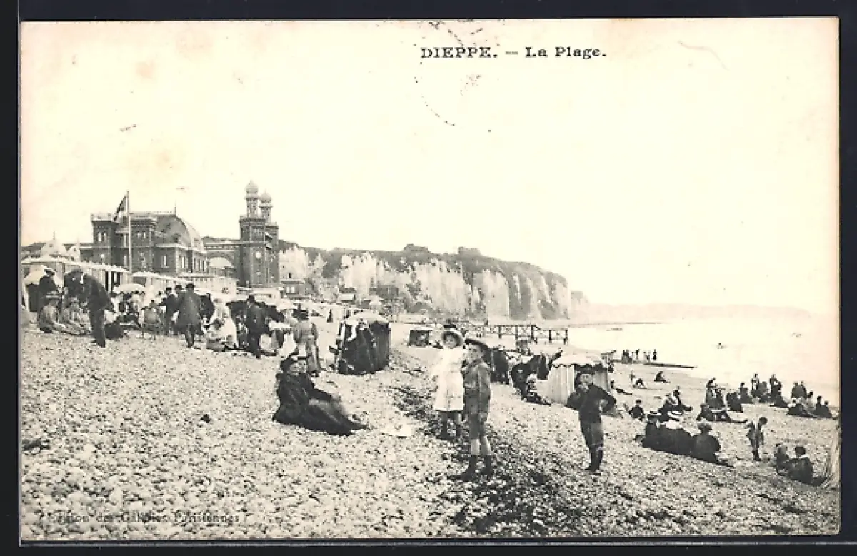 AK Dieppe, La Plage avec des baigneurs et vue sur les falaises et le casino