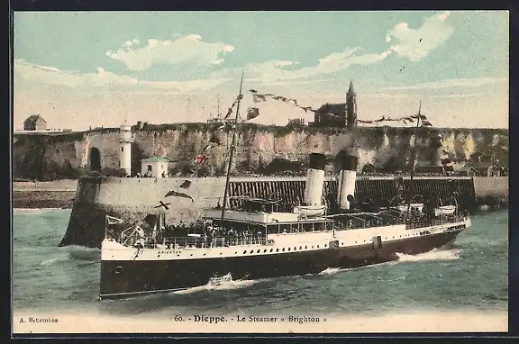 AK Dieppe, Le Steamer «Brighton» quittant le port devant les falaises