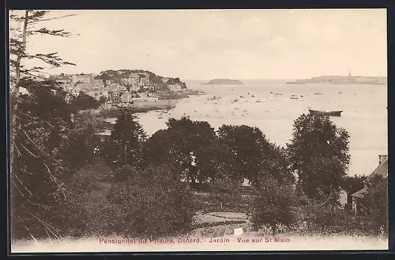 AK Dinard, Pensionnat du Prieuré, Jardin avec vue sur Saint-Malo