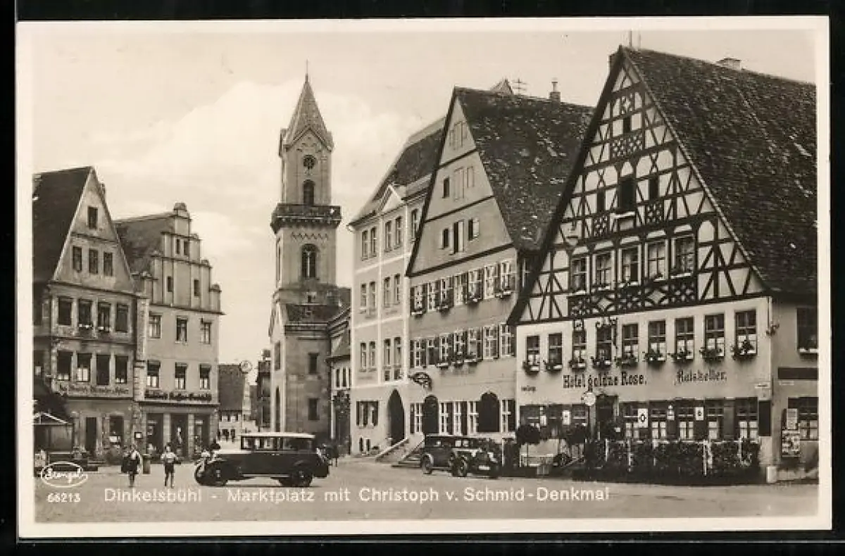 AK Dinkelsbühl, Marktplatz mit Christoph v. Schmid-Denkmal, Hotel Goldne Rose