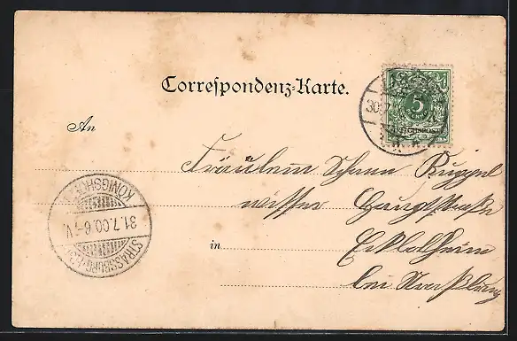alte Ansichtskarte, gelaufen 1900, kleiner Einriss unten mittig, guter Zustand