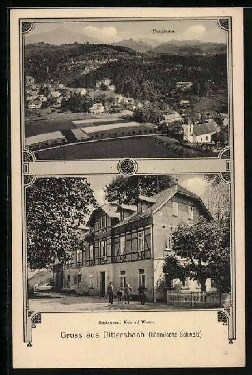 AK Dittersbach / Jetrichovice, Partie am Restaurant Konrad Worm, Panoramaansicht