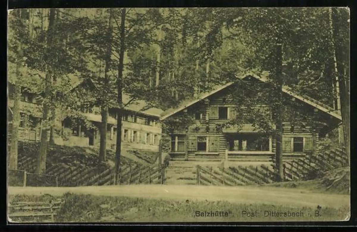 AK Dittersbach i. B., Balzhütte mit Grünanlagen