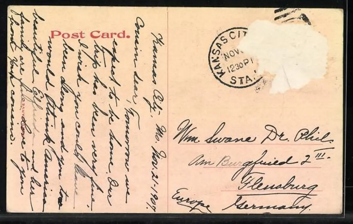 alte Ansichtskarte, gelaufen, Briefmarke entfernt, rückseitig Oberflächenschaden, Stempelspur