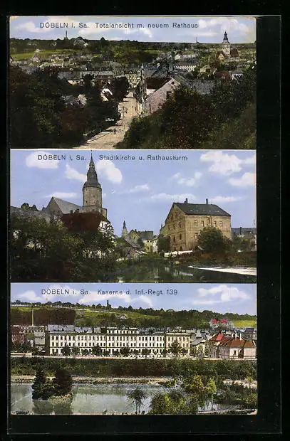 AK Döbeln i. Sa., Totalansicht mit neuem Rathaus, Stadtkirche und Rathausturm, Kaserne d. Inf.-Regt. 139