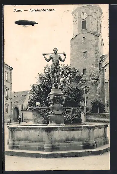 AK Dohna, Fleisch-Denkmal mit Zeppelin, Luftschiff