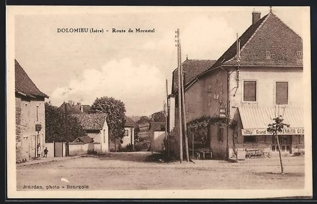 AK Dolomieu /Isère, Route de Morestel avec le grand café Perrier et vue de la rue animée