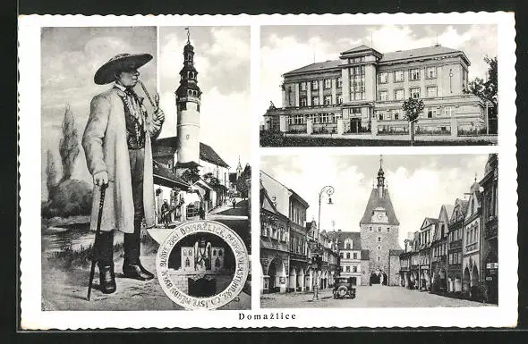 AK Domazlice, Gebäudeansicht, Strassenpartie mit Tor, Turm