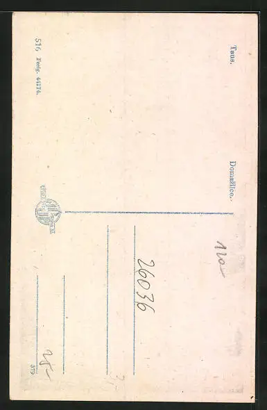 Personenbezogene Daten auf der Rückseite der Karte wurden durch blauen Textmarker unkenntlich gemacht. Die blauen Stellen sind auf die Vorderseite durchgeweicht und wirken sich negativ auf das Postkartenfoto aus