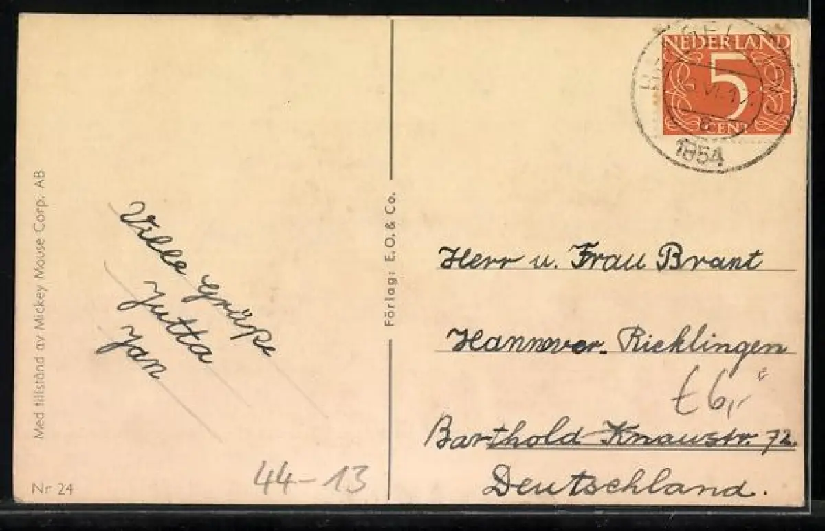 Personenbezogene Daten auf der Rückseite der Karte wurden durch blauen Textmarker unkenntlich gemacht. Die blauen Stellen sind auf die Vorderseite durchgeweicht und wirken sich negativ auf das Postkartenfoto aus