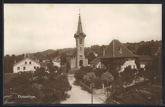 AK Donneloye, Ortsansicht mit Strasse u. Kirche aus der Vogelschau