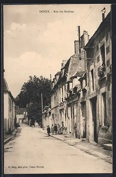 AK Donzy, Rue des Moulins animée avec passants et maisons anciennes