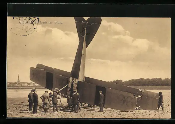 AK Doppeldecker-Flugzeug steht mit der Schnauze auf der Erde, glücklich verlaufener Absturz