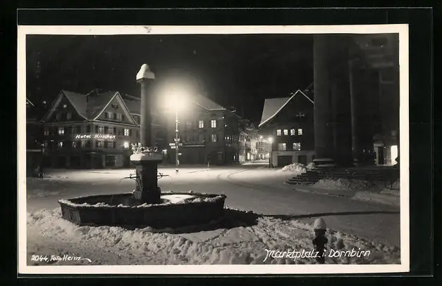 AK Dornbirn, Marktplatz im Schnee mit Brunnen und Hotel Hirschen