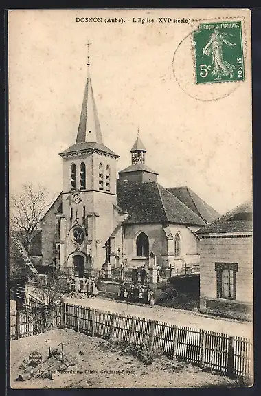 AK Dosnon, L`Église du XVIe siècle avec villageois devant l`entrée