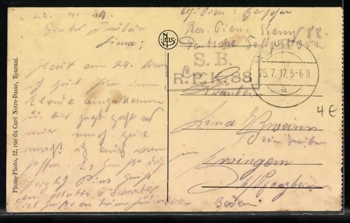 Personenbezogene Daten auf der Rückseite der Karte wurden durch blauen Textmarker unkenntlich gemacht. Die blauen Stellen sind auf die Vorderseite durchgeweicht und wirken sich negativ auf das Postkartenfoto aus