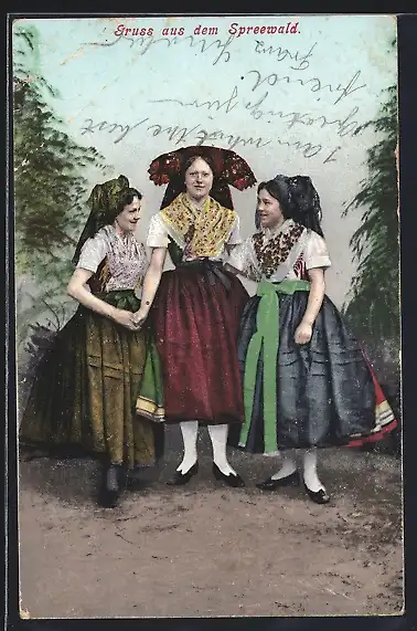 AK Drei Frauen in Tracht aus dem Spreewald Arm in Arm