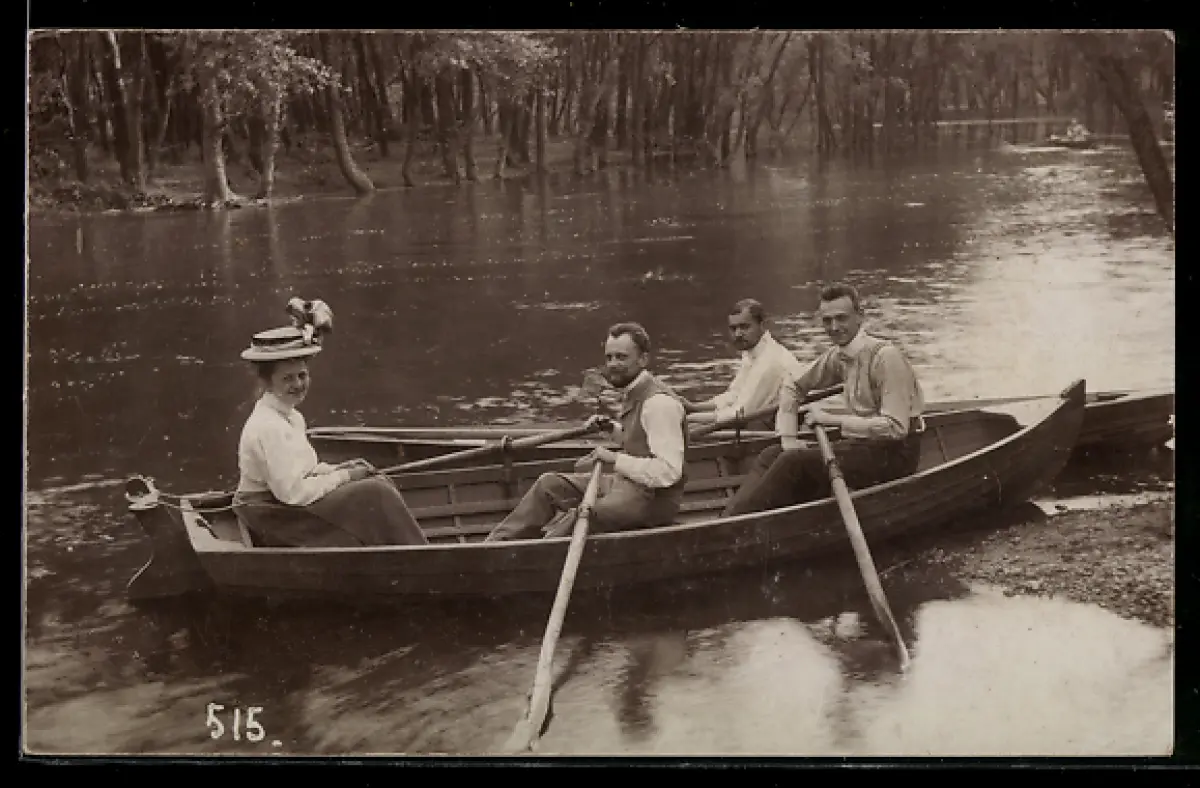 AK Drei Männer mit Frau im Ruderboot
