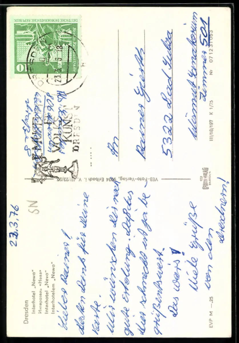 alte Ansichtskarte, gelaufen 1976, Bugspur unten mittig