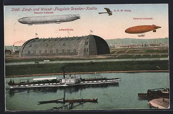 AK Dresden-Kaditz, Städt. Land- & Wasser-Flugplatz mit Zeppelin-Luftschiff, D.-F.-W.-Taube