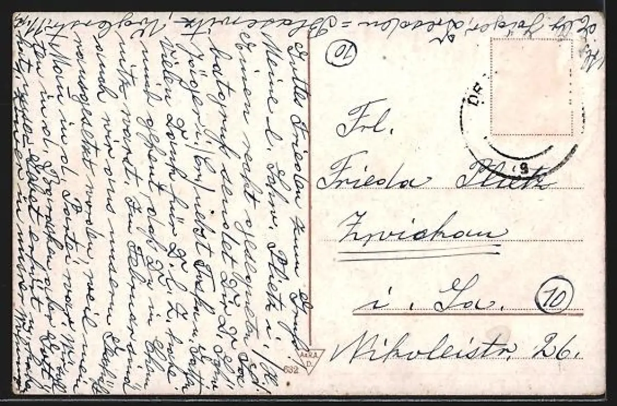 alte Ansichtskarte, gelaufen, Briefmarke entfernt, Abriebspur oben mittig, guter Zustand