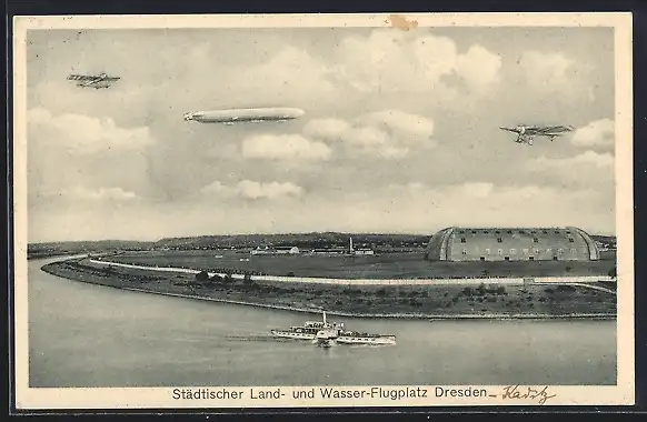 AK Dresden, Städt. Land- und Wasser-Flugplatz, Panorama mit Luftschiff