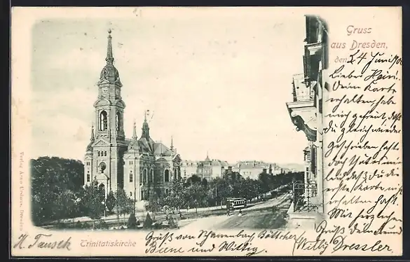 AK Dresden, Trinitatiskirche mit Strassenbahn