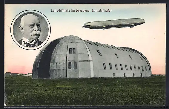 AK Dresden, Zeppelin über der Luftschiffhalle im Luftschiffhafen, Portrait Graf Zeppelin