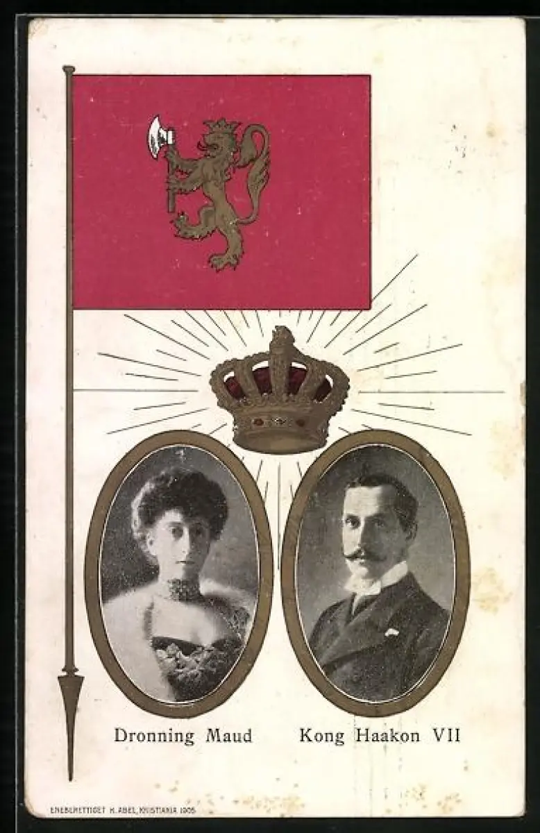 AK Dronning Maud & Kong Haakon VII., Königspaar von Norwegen und Fahne