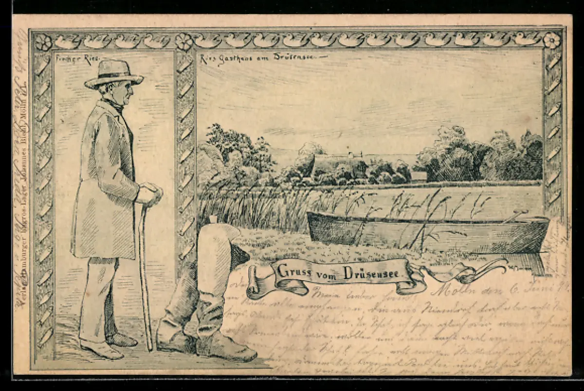 AK Drüsen, Ries Gasthaus am Drüsensee, Portrait Fischer Ries