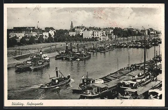 AK Duisburg, Hafenpartie mit einer Kolonne and Dampfern und Segelbooten